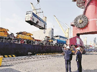 厦企生产的定制化高端客车吊装上船。(供图/厦门海事局)