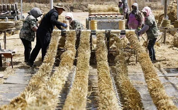 2026年4月10日,在宁夏中卫市沙坡头区迎水桥镇黑林村,治沙工人用机械编织刷状网绳式草方格。新华社记者 王鹏 摄
